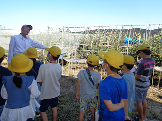 1年生、2年生、3年生が地域探検に行きました。はじめに行ったのは、梨農園を営んでおられる石田さんの所です。時期が少し遅かったので、収穫が終わってしまったようです。別の種類の梨は、収穫にはまだ早いということでした。梨づくりについてのいろいろなお話を聞きました。来年は、梨の収穫に合わせて探検に来てくださいと石田さんが言ってくださいました。ご多用の中、ありがとうございました。集会所に行くと「うぐい」が置いてありました。子どもたちが探検に来るということで、地域の方が準備をしてくださったようです。傘をかぶったり、うぐいを突くまねをしたりしました。今年の「大堤のうぐいつき」は明後日10月2日です。うぐいの中には、紙で作った本物そっくりの魚が入っていました。明後日のうぐいつきでは、本物の大きな魚が入るといいなあと思います。公園でたくさん遊びました。会下(えげ)に住んでいる子どもたちは、自分の集落に友達が遊びに来てくれて、とっても喜んでいました。もっともっと案内したい所がたくさんあったようですが時間がなくて残念。次は、殿集落へ探検に行く予定です。